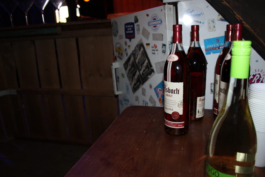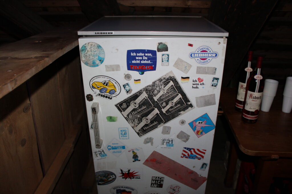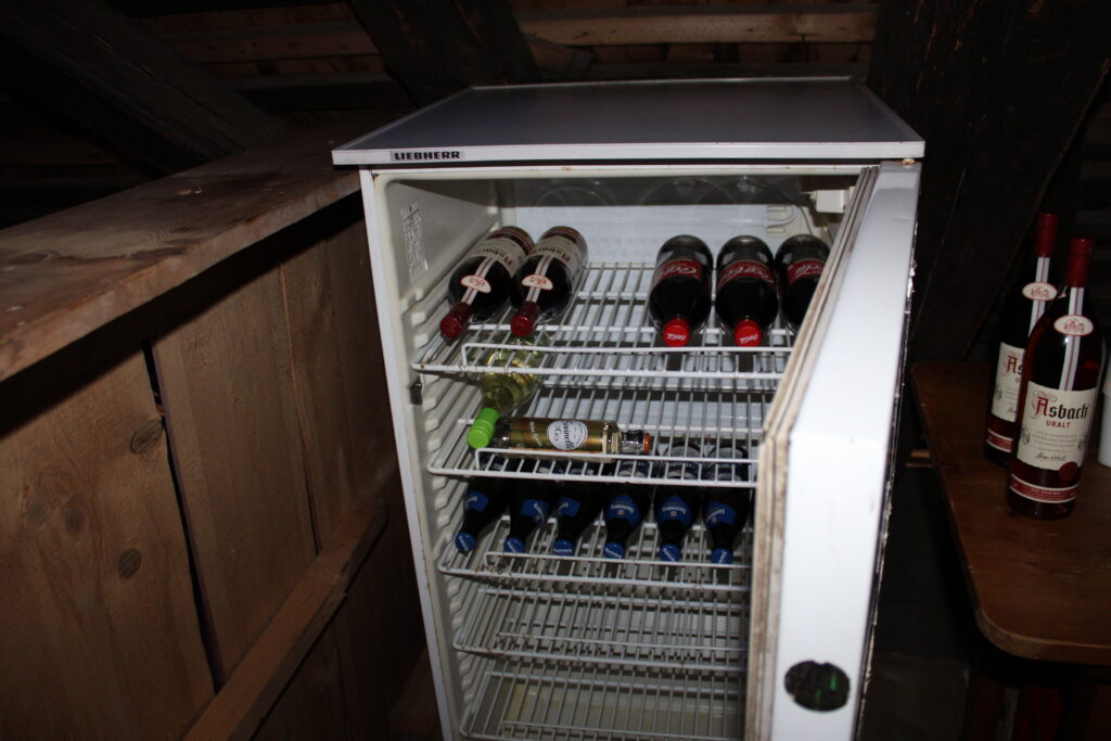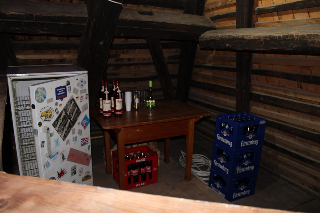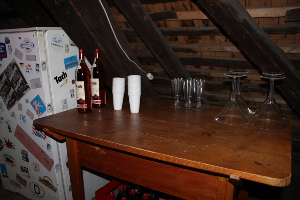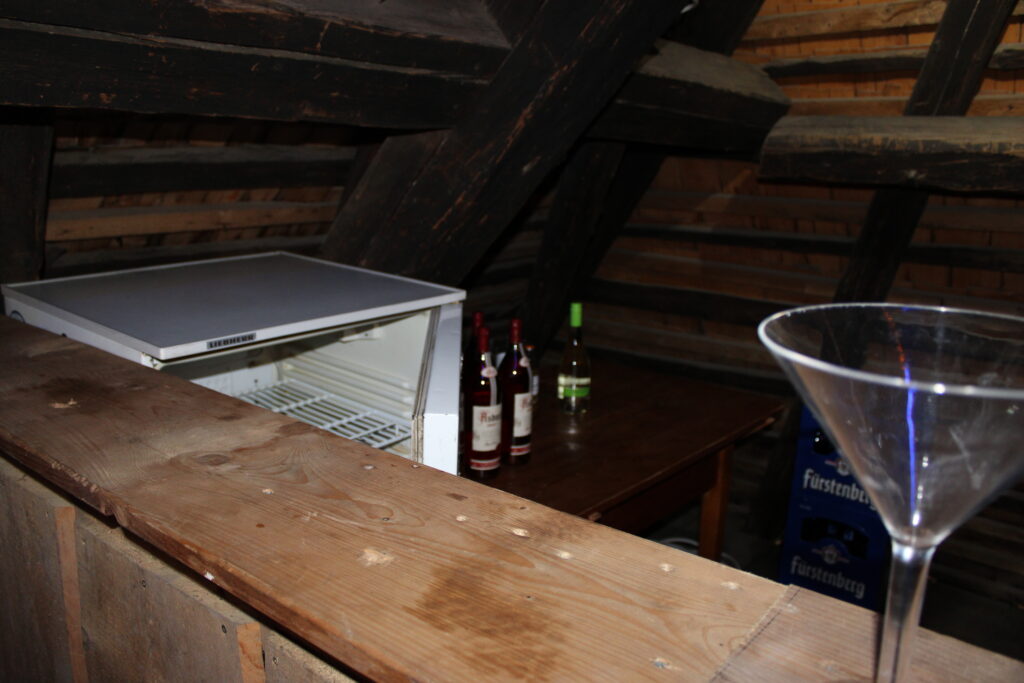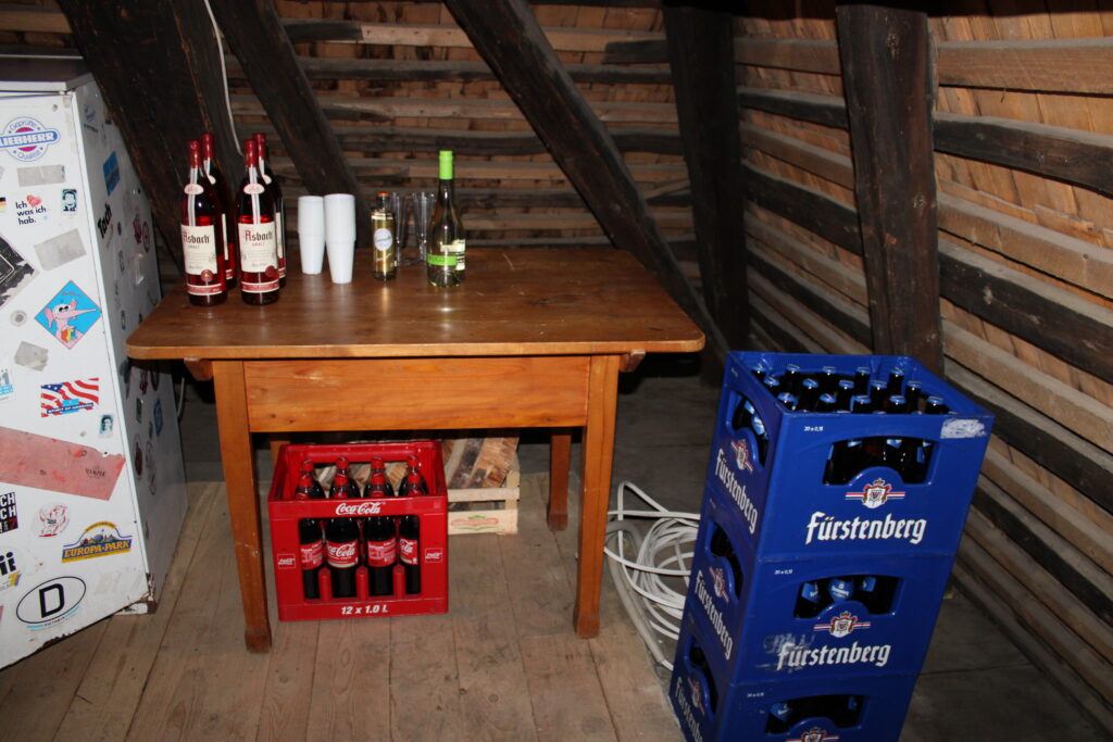 Getränke & Kühlschrank: Für das kühl halten der Getränke, steht ein Kühlschrank mit 6 fächern bereit. Ein kleiner Tisch daneben dient zur Zubereitung. Am Rand der Bar, unter der Dachschräge ist reichlich platz, um Getränkekisten zu lagern. Alle Getränke müssen selbst besorgt, mitgebracht und verbraucht werden!