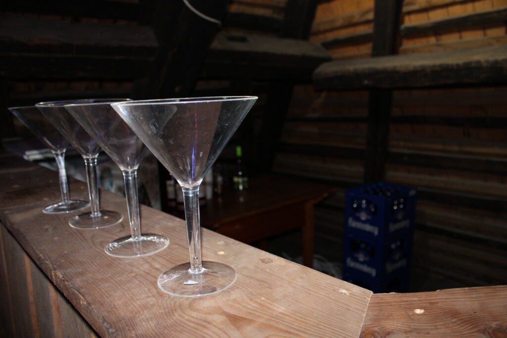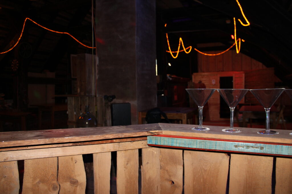 Aufbau: Die selbstgebaute Bar wurde aus Holzbrettern erbaut. Hinter der langen Tresen können mehrere Personen gleichzeitig für Getränke sorgen.