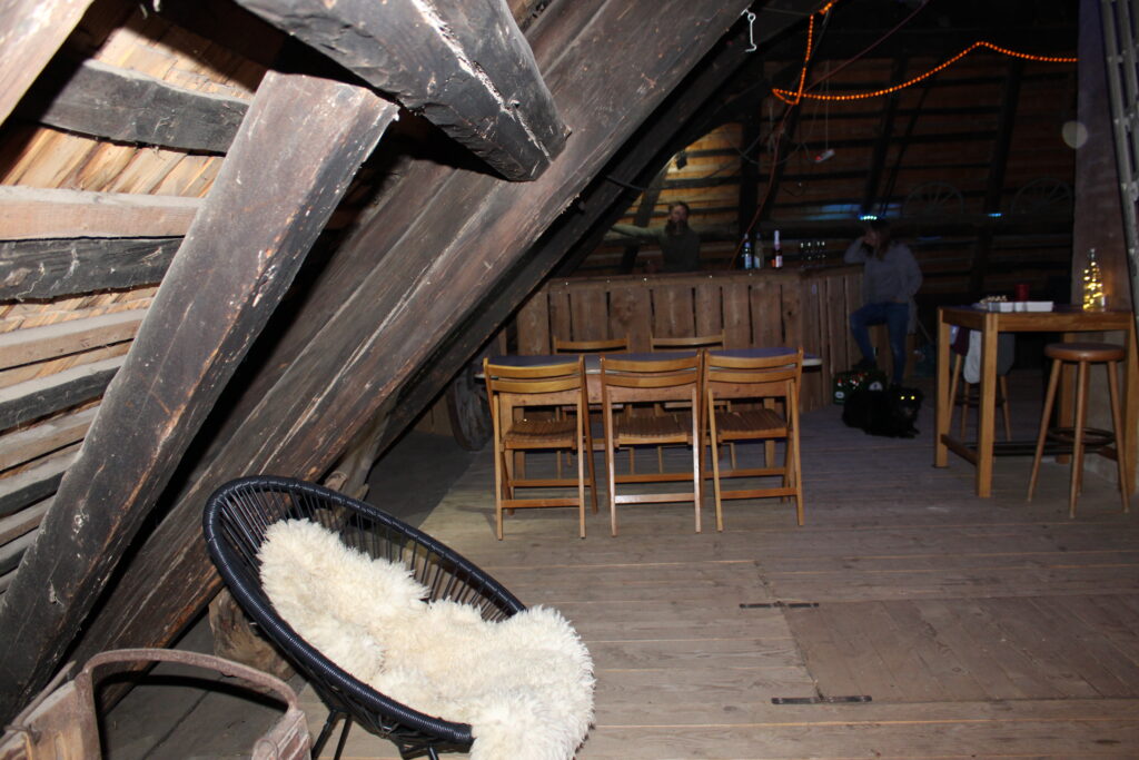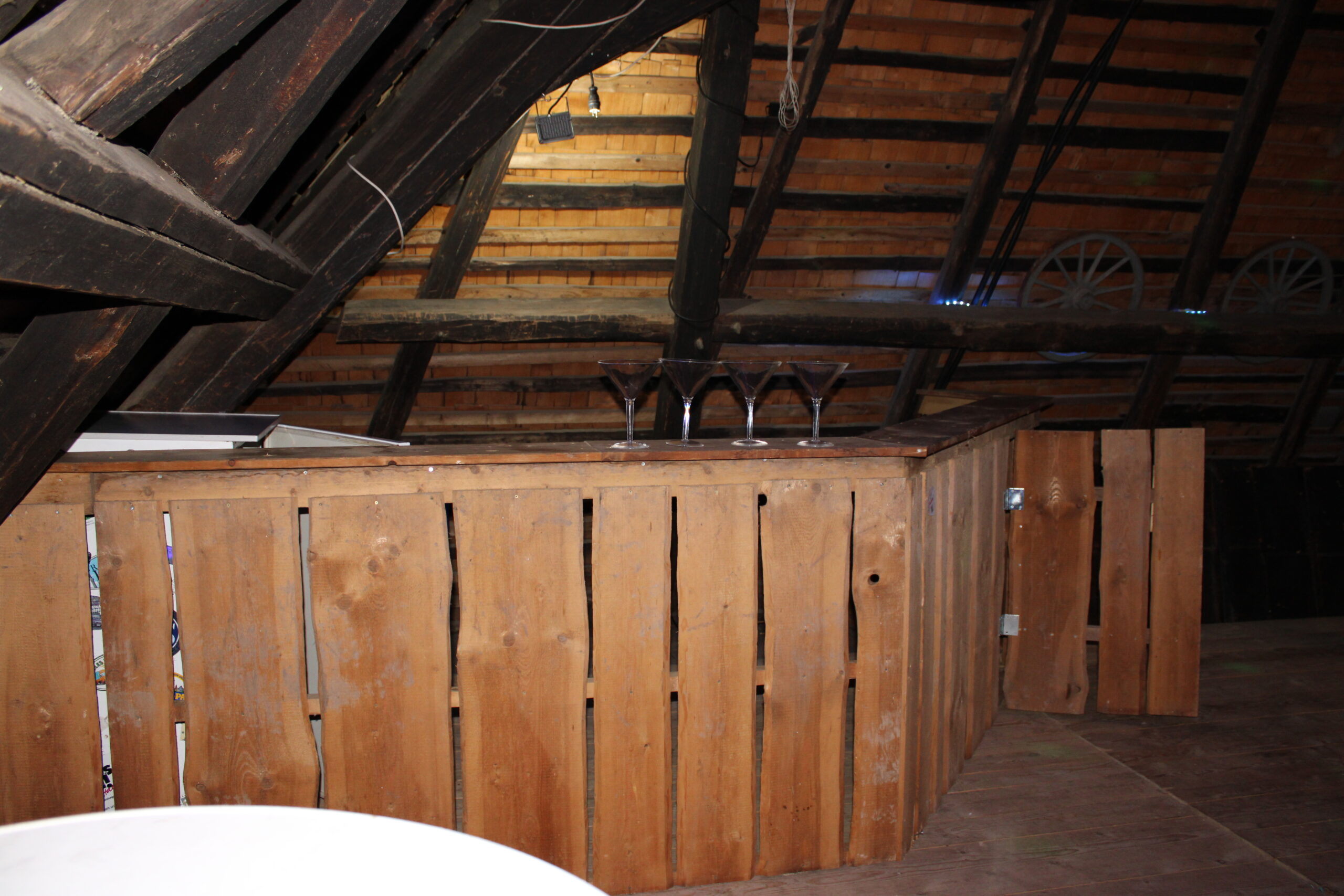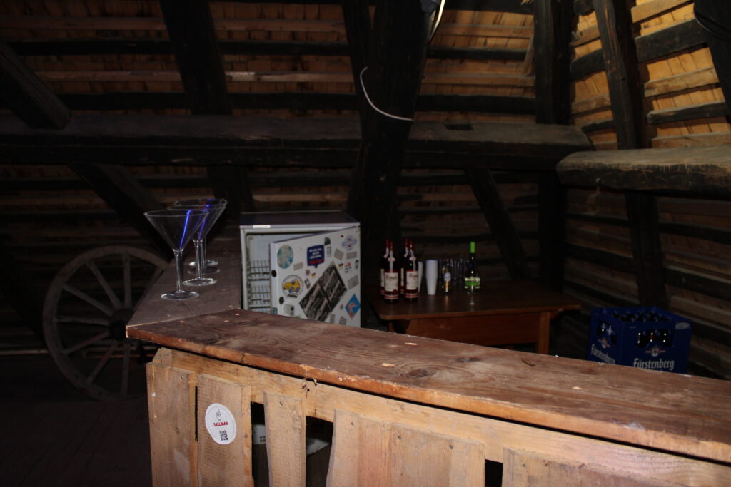 Die Bar hat eine kleinen Durchgang, der per Riegel passiert werden kann. Dahinter befindet sich ein kleiner Tisch + Palettenregal, die zur Lagerung und Zubereitung der Getränke benutzt werden können.